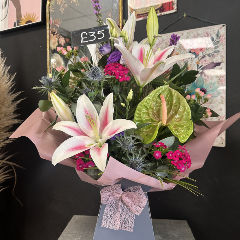 A bouquet of flowers presented in a box with cellophane, in oasis facing forward. Perfect for leaving as is, no need to move to a vase or rearrange. Best option for giving as a sympathy gift. From £35. For specific flowers or colours, please add into additional notes section at check out.
