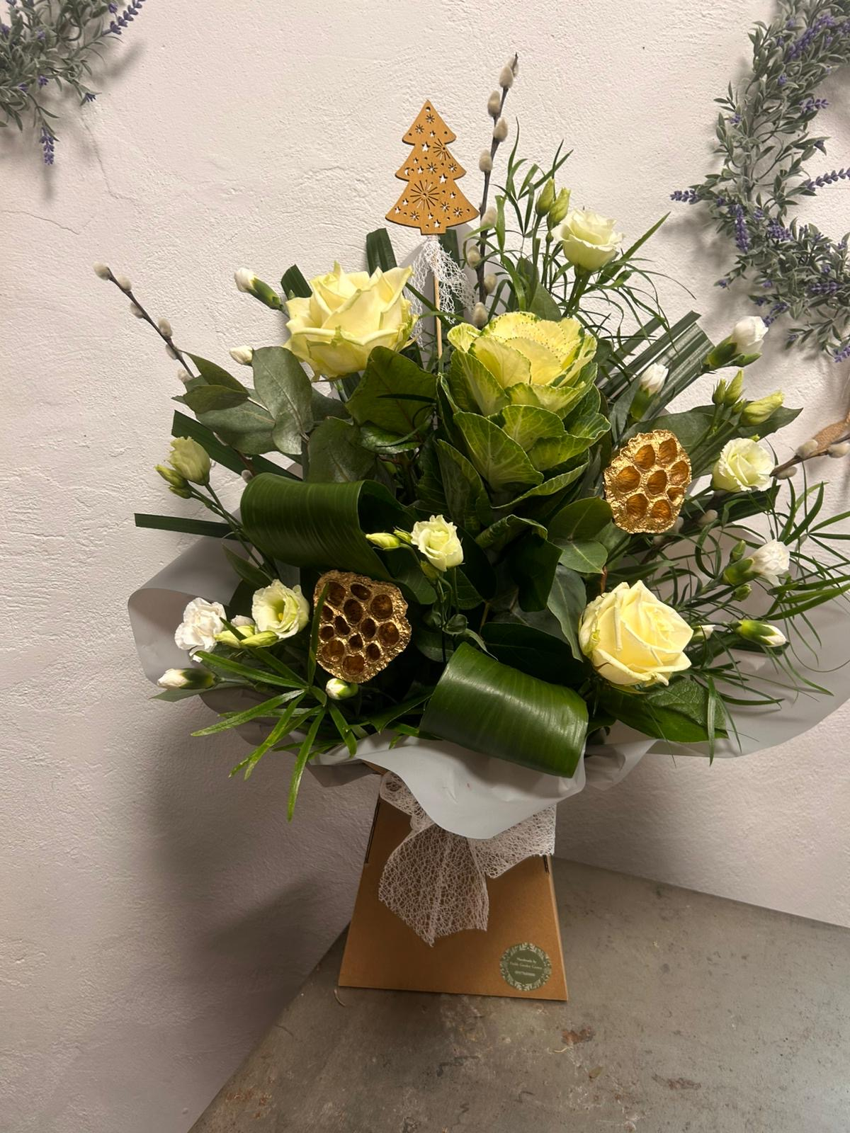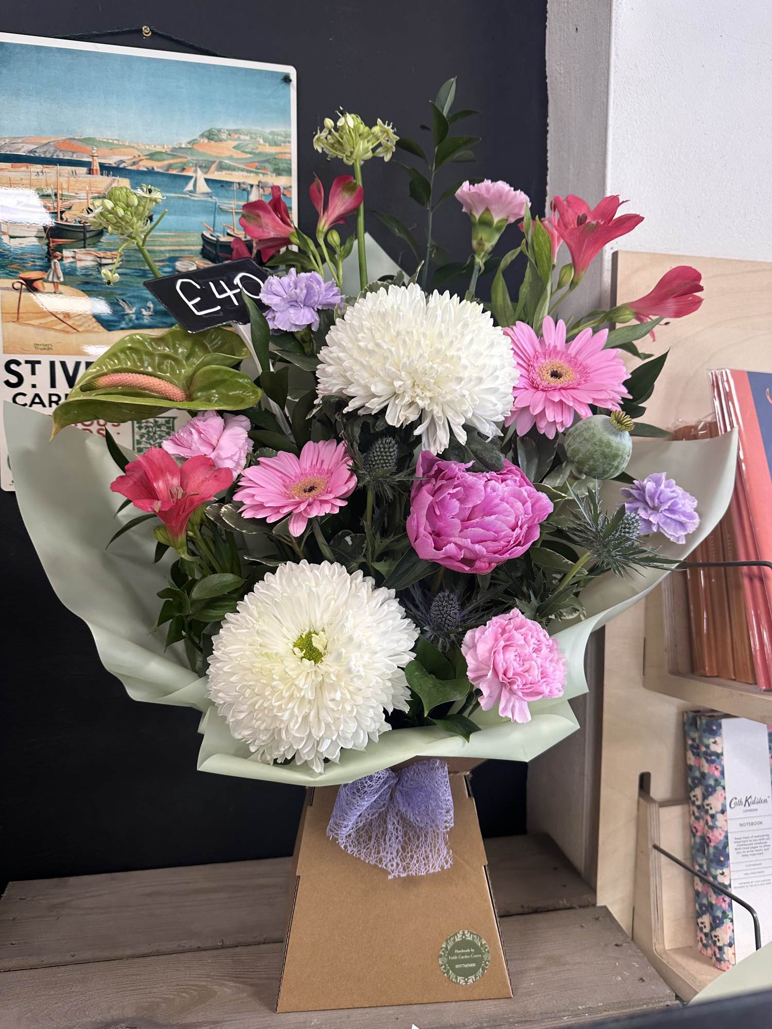 A bouquet of flowers presented in a box with cellophane, in oasis facing forward. Perfect for leaving as is, no need to move to a vase or rearrange. Best option for giving as a sympathy gift. From £35. For specific flowers or colours, please add into additional notes section at check out.