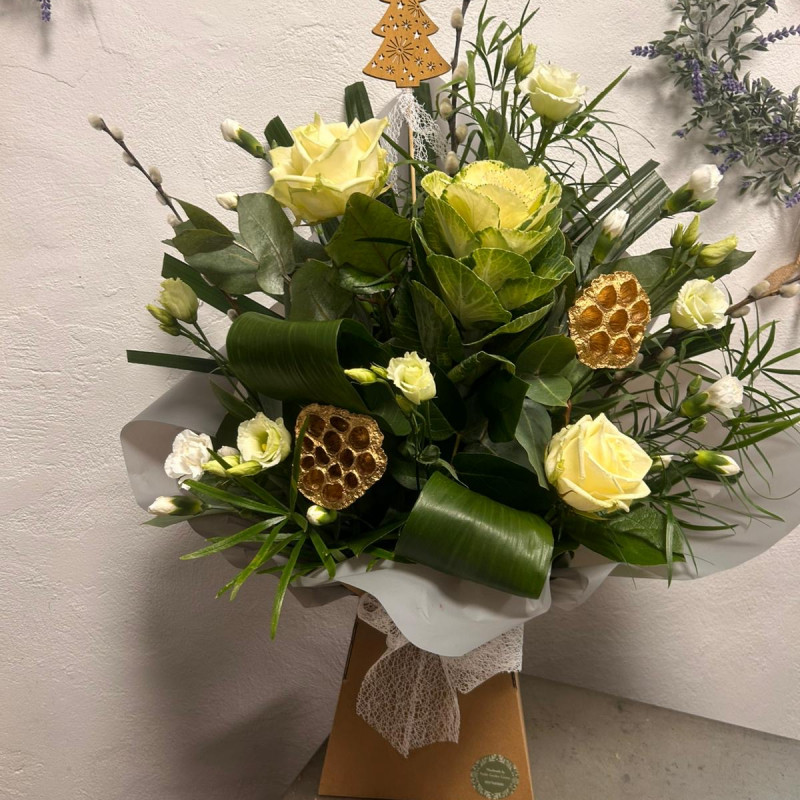 A bouquet of flowers, presented in a box wrapped in cellophane with water bowl. Best option for gifts or occasions. For specific colours or flowers, please call 01977685000 to request unless happy with florists recommendations.